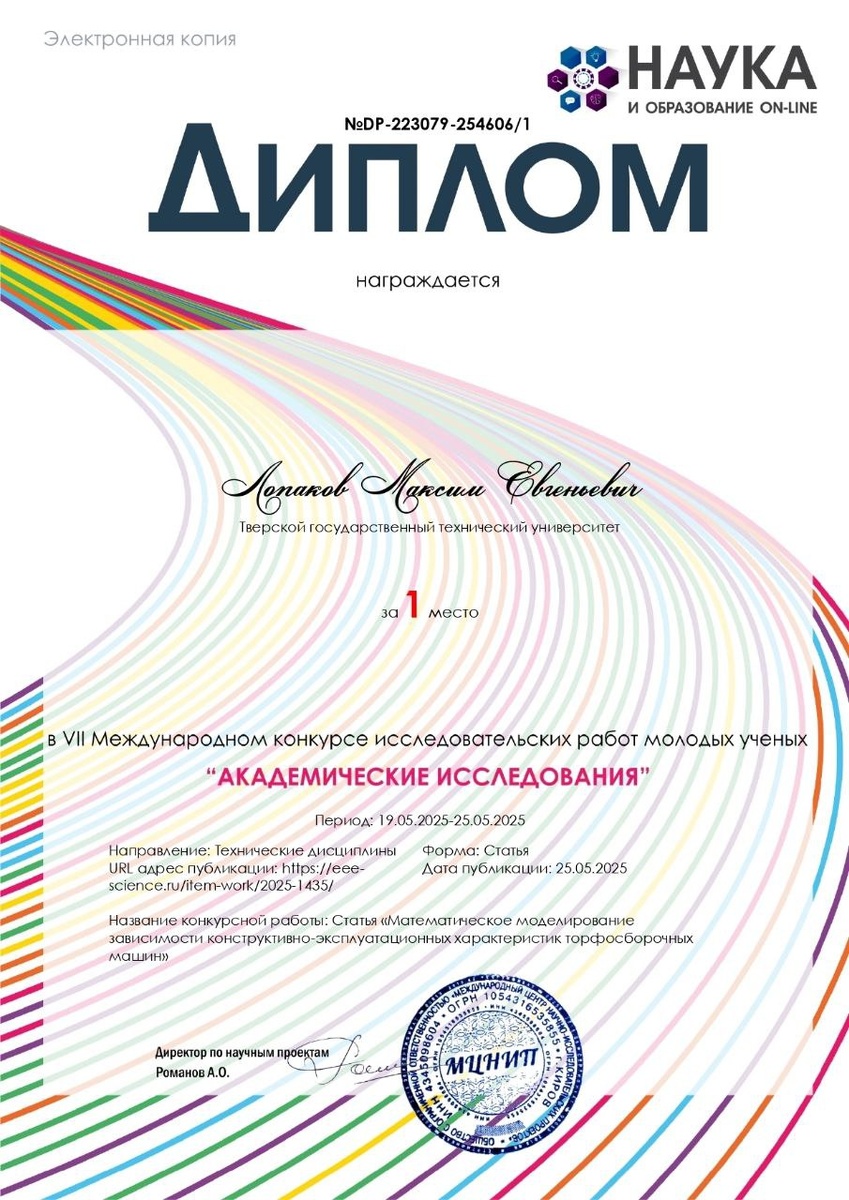 🏆 Студенты ТвГТУ - победители Международного конкурса исследовательских работ Студенты второго курса факультета Природопользования и инженерной экологии Максим Лопаков и Алексей Лебединцев заняли первое место на VII Международном конкурсе исследовательских работ молодых ученых «Академические исследования 2024/25». На конкурс студенты представили результаты исследования «Математическое моделирование зависимости конструкционно-эксплуатационных характеристик торфосборочных машин», выполненного под научным руководством профессора кафедры высшей математики Борисовой Е.В.