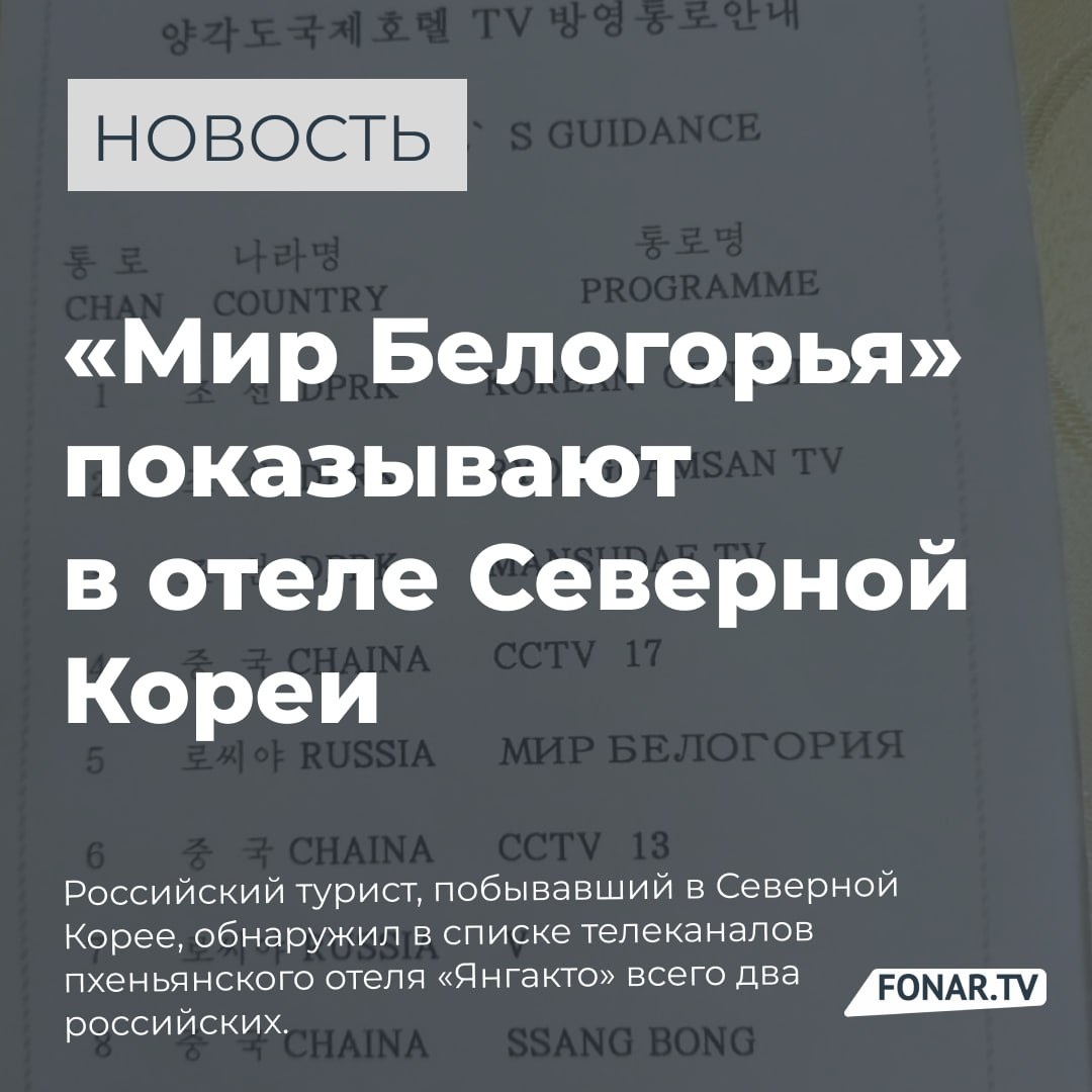🏨 «Мир Белогорья» — в эфире Пхеньяна! (или как белгородский телеканал оказался в самом закрытом государстве мира). Пожалуй, один из самых неожиданных travel-фактов года: российский турист, посетивший Северную Корею весной 2025 года, обнаружил в своём пхеньянском отеле не что-нибудь, а телеканал «Мир Белогорья»! Да-да, региональный канал из Белгородской области спокойно вещал на телеэкране гостиницы «Янгакто» — вместе с репортажами о Ким Чен Ыне и китайским CCTV13. Всего в номере ловилось всего девять каналов, и лишь два из России. Второй — загадочный «V», возможно, это «Пятый канал» или «Ю», но «Мир Белогорья» точно было на месте. Турист признался, что раньше о таком канале и не слышал — теперь точно не забудет. Показывают ли белгородские новости во всех отелях Пхеньяна — неизвестно. Но сам факт: пока мир спорит о санкциях и геополитике, где-то под портретами Ким Ир Сена кто-то может смотреть утренний эфир про сельское хозяйство Белгородчины (и не только). 🔦Подпишись на «Фонарь»