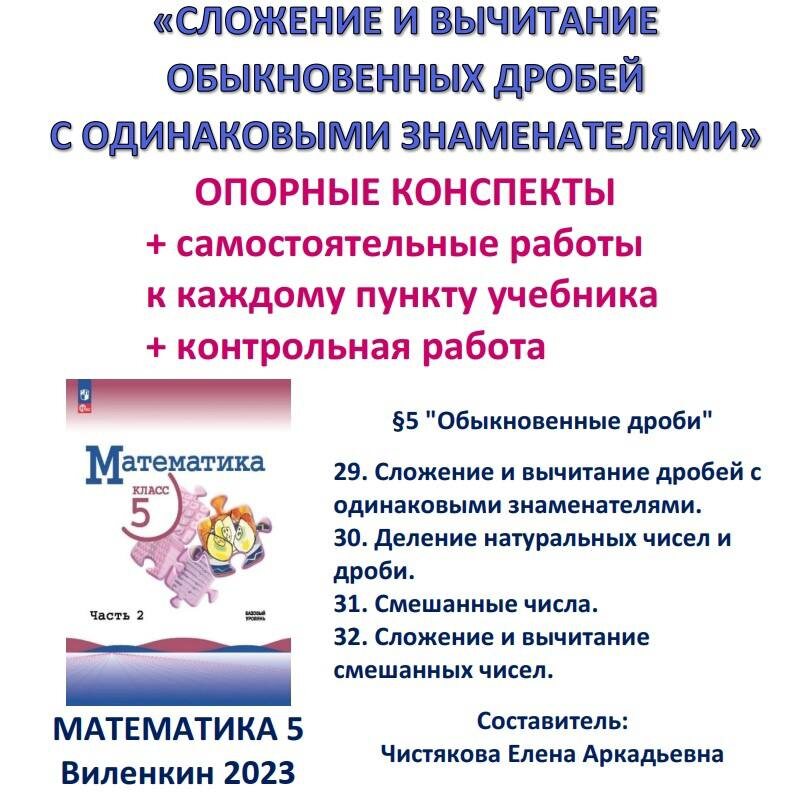 ❗Внимание❗✨Новинка✨ 🆗5 класс Опорные конспекты + Самостоятельные работы + Контрольная работа "Сложение и вычитание дробей с одинаковыми знаменателями" Виленкин Просвещение 2023 📥Скачать на WB: digital.wildberries.ru/offer/495779 Содержит: 🔹4 опорных конспекта к п.29-32 учебника "Математика 5" Виленкин 2023; 🔹5 самостоятельных работ с ответами; 🔹 контрольную работу по теме в 6 вариантах с полным решением. Материал скомпонован в три PDF файла: 🔹Файл учителю 11 страниц. 🔹Файл репетитору 12 страниц. 🔹Файл ответы 19 страниц. Материал предназначен для изучения §5 "Обыкновенные дроби": 29. Сложение и вычитание дробей с одинаковыми знаменателями. 30. Деление натуральных чисел и дроби. 31. Смешанные числа. 32. Сложение и вычитание смешанных чисел. 📚 Все мои материалы в таблице: vk.cc/cHlmAx Открывайте вкладку с нужным вам классом.