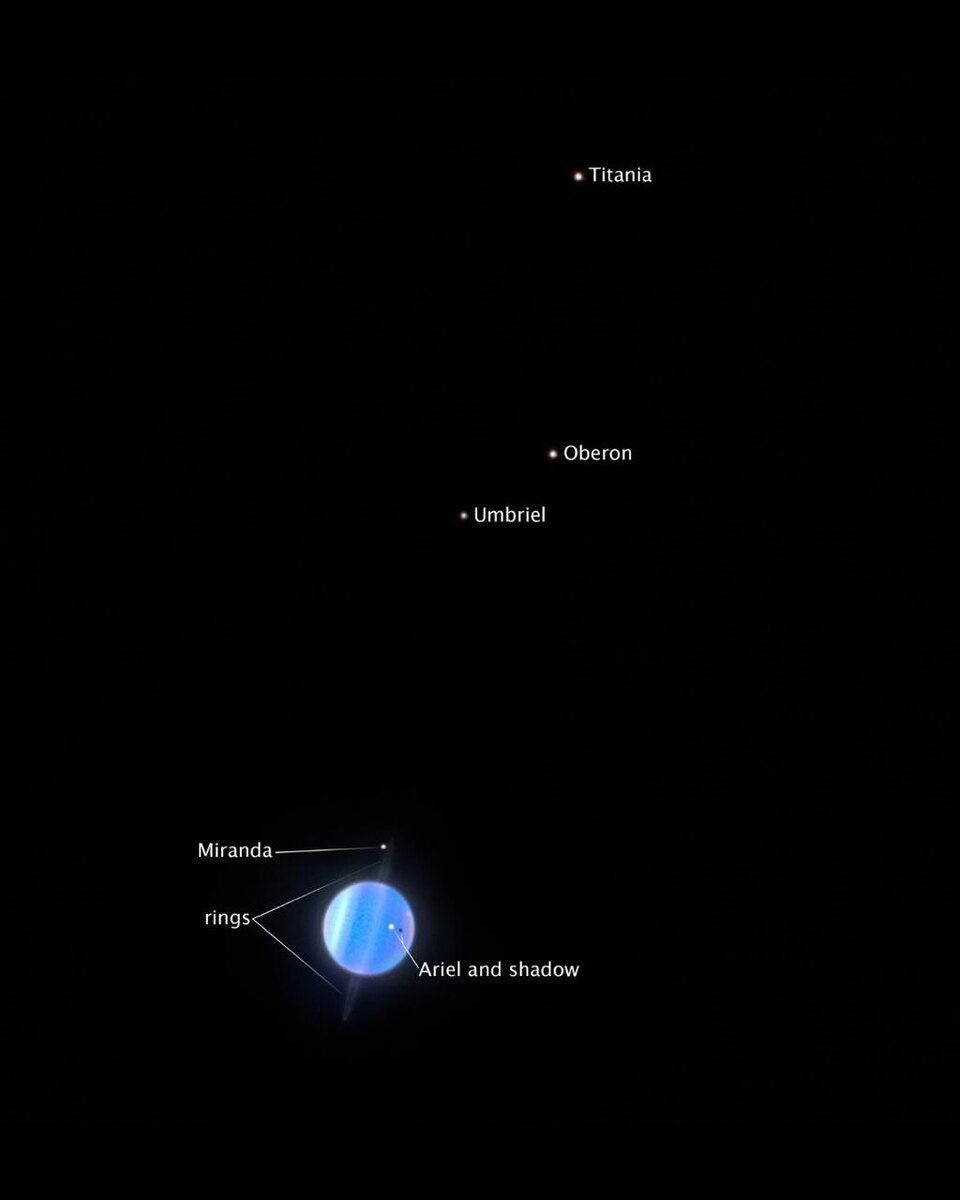 Ледяные спутники Урана — Ариэль, Умбриэль, Титания и Оберон — с Земли видны как крошечные точки света. Однако благодаря ультрафиолетовым возможностям космического телескопа NASA/ESA Hubble астрономы смогли определить характеристики их поверхностей.
