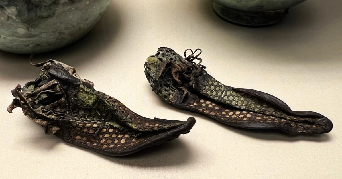 Изначально эта пара женской обуви была пурпурного цвета со светлой подкладкой. Украшена позолоченной металлической нитью. Для того времени обувь роскошная и очень дорогая.
