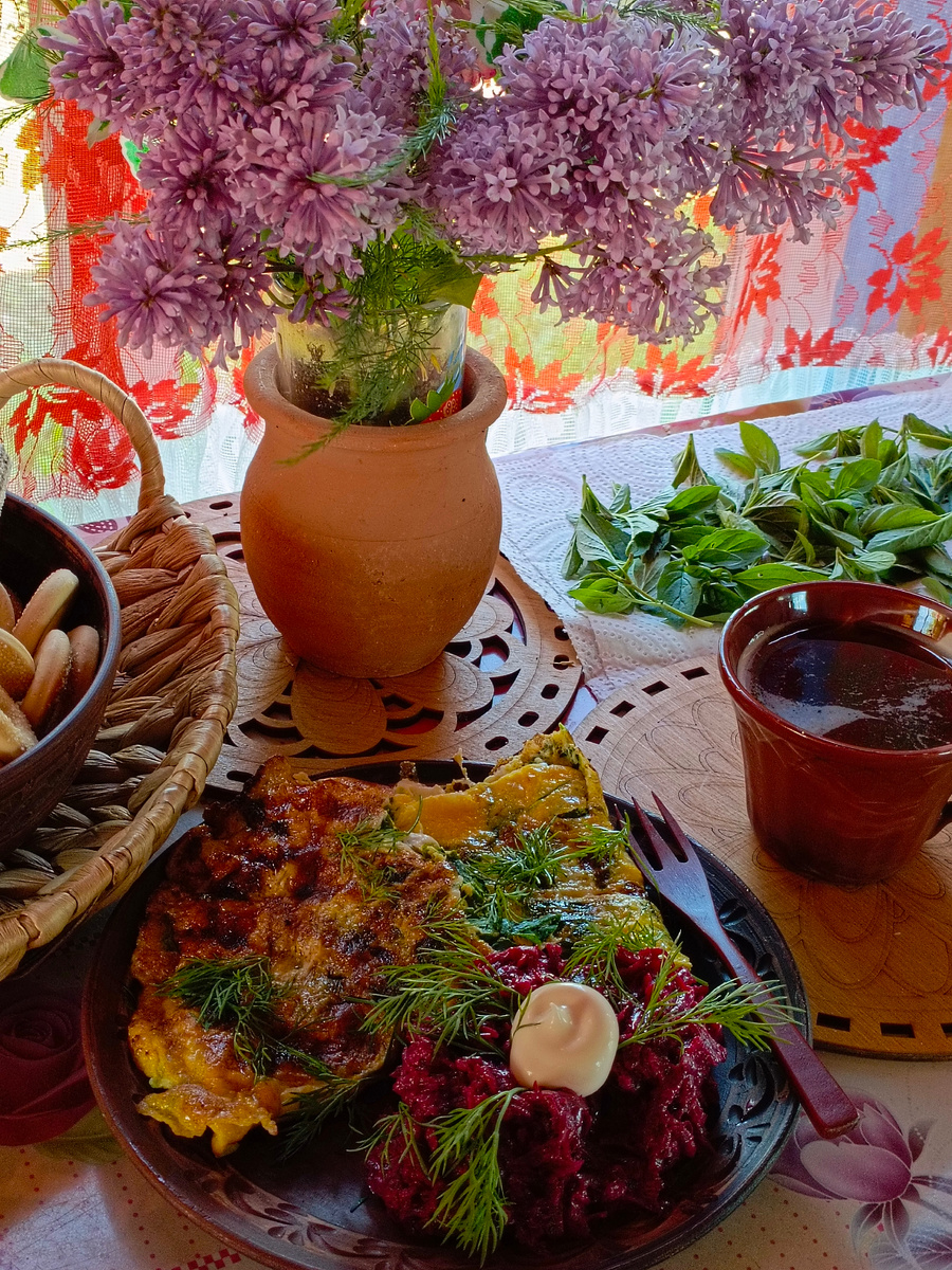 Ах, дачная жизнь! Ни что не сравнится с обедом, приготовленным из свежайших продуктов , выращенных своими руками. Сегодня у меня была настоящая феерия вкуса: яичница со шпинатом, выросшем на собственной грядке и яйца, конечно же , от домашних курочек - с ярким желтком и обалденный вкусом. А ещё в моей тарелке красовалась свекла, последняя осталась с прошлого года из погреба, сладкая, сочная с майонезом и чесноком. Мммм..... В кружечке прохладный квас, а в вазочке букет ароматной сирени.