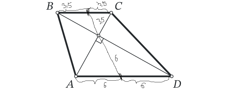 В трапеции ABCD с основаниями AD и BC диагонали AC и BD перпендикулярны. Чему равна длина отрезка, соединяющего середины сторон AD и BC, если AD=12, BC=7? Ответ 9.5 В трапеции ABCD с основаниями AD и BC известно, что ∠A+∠D=90∘. Чему равна длина отрезка, соединяющего середины сторон AD и BC, если AD=11, BC=7? Пусть B1M - отрезок, соединяющий середины оснований. Достроим А1В1 параллельный АВ и B1D1 параллельный BD. Тогда угол A1B1D1 будет прямым. A1D1=11-7=4 B1M - медиана из прямого угла, равная половине гипотенузы Ответ 2 Дан четырёхугольник ABCD, в котором ∠A=90∘, ∠B=120∘, ∠D=30∘. Пусть AB=7, BC=5. Чему равно CD? Достроим до прямоугольного треугольника AXD. Угол Х получится 60 градусов, А треугольник ВХС равносторонним. XD будет равно удвоенному АХ, а т.к. ХС =5, то CD=12*2-5=19 Ответ 19 Угол C треугольника ABC равен 150∘. Из середины стороны AB на сторону BC опустили перпендикуляр. Найдите длину этого перпендикуляра, если AC=1. Достроим до прямоугольного треугольника АВХ. Рассмотрим т