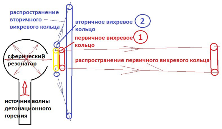Мы ожидали увидеть на выходе из нашего сферического резонатора (это такая круглая "пушка", которая формирует взрывную волну) одно мощное вихревое кольцо. Но камера на сильно замедленной съёмке показали нечто невероятное: на выходе формируется не одно, а сразу два вихревых кольца! Мы назвали это "детонационно-резонансным эффектом образования пары вихревых колец".