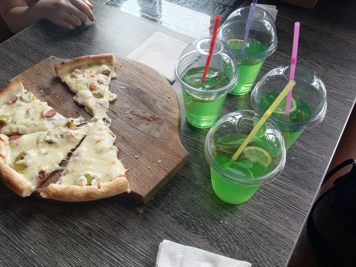 Мы уже в этой кафешке не раз бывали, перепробовали все напитки, и этот всем больше всего понравился. Взяли сразу шесть штук – водохлёбы мы все! Пицца вкусная, всем пришлась по душе.