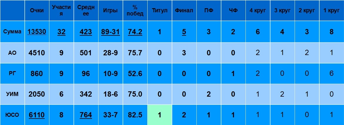 Еще впечатляют результаты на АО: 3 участия – полуфинал + 2 четвертьфинала! 533 очка в среднем за турнир. Но, этого удалось добиться одержав всего 8 побед. Сейчас для такого результата пришлось бы победить 13 раз: 5 + 4 + 4.