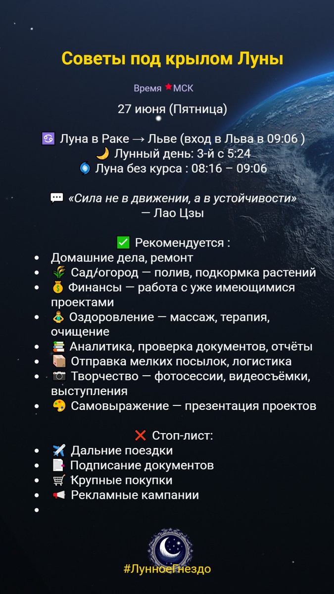 🏡 27.06.2025 — число дня: 6 «Энергия гармонии, любви и заботы» Сегодня Вселенная напоминает тебе о главном — Любовь, семья, дом и внутренний баланс. Число 6 приносит в этот день: ✔️ Гармонию в отношениях ✔️ Поддержку в делах сердца ✔️ Вдохновение в творчестве ✔️ Ощущение уюта и покоя 💎 Что делать: ✅ Удели внимание близким — даже маленькое «спасибо» сегодня много значит ✅ Создай уют вокруг себя — благополучие начинается с порядка в душе и пространстве ✅ Слушай своё сердце — оно знает правильный путь ⚠️ Осторожно: Не забывай про себя в заботе о других. Любовь к себе — основа всего. 💫 Сегодня день зовёт тебя к теплу, свету и истинным ценностям. Прими его дар.