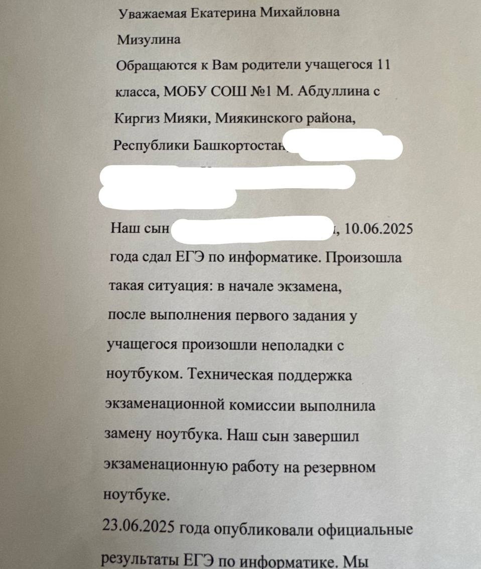 Екатерина Мизулина вмешалась в ситуацию с ноутбуком на ЕГЭ в Башкирии, которая вызвала обсуждение. Родители выпускника из села Киргиз-Мияки обратились к директору Лиги безопасного интернета с просьбой помочь разобраться в сложившейся ситуации во время проведения экзамена по информатике. В школе № 1 этого села во время ЕГЭ произошёл инцидент, о котором стало известно Екатерине Мизулиной. Согласно её сообщению, во время экзамена у школьника возникли технические неполадки с ноутбуком после выполнения первого задания. В результате организаторы заменили неисправное устройство, а студент продолжил работу на резервном гаджете. По результатам экзамена, полученным 23 июня, выяснилось, что оценка поставлена по данным с первого ноутбука, тогда как работа с резервного была не учтена. Семья выпускника попыталась получить разъяснения у чиновников, и выяснилось, что оба ноутбука были отправлены в Региональный центр обработки информации. Однако, при попытке связаться с этим центром, им сообщили, что ф