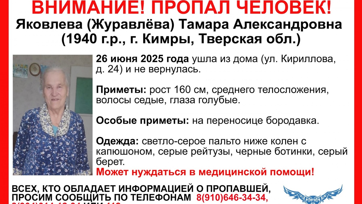 26 июня в Кимрах Тверской области, из дома 24 на улице Кириллова ушла и не вернулась 85-летняя Тамара Александровна Яковлева.