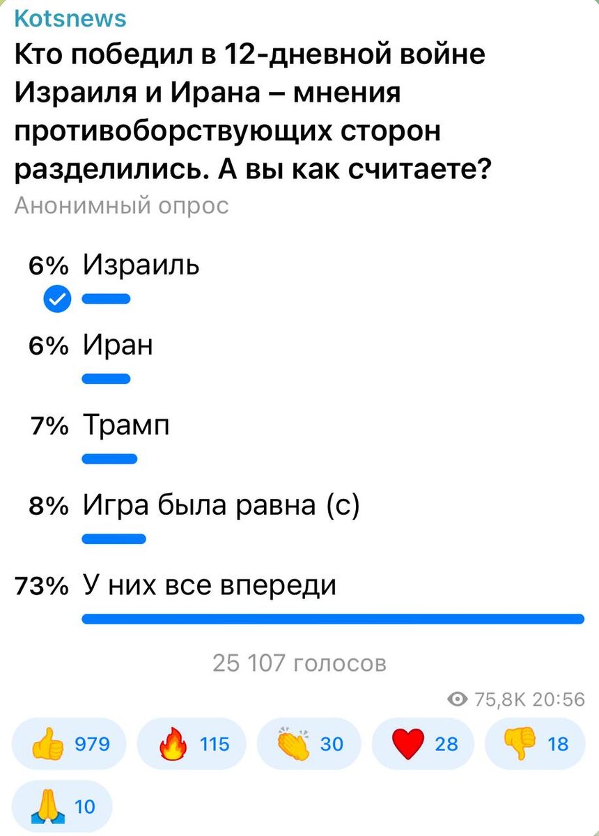 ⚡️⚡️⚡️ 73 процента подписчиков считают, что у Израиля с Ираном еще все впереди. На Ближнем Востоке никогда не бывает все в порядке.