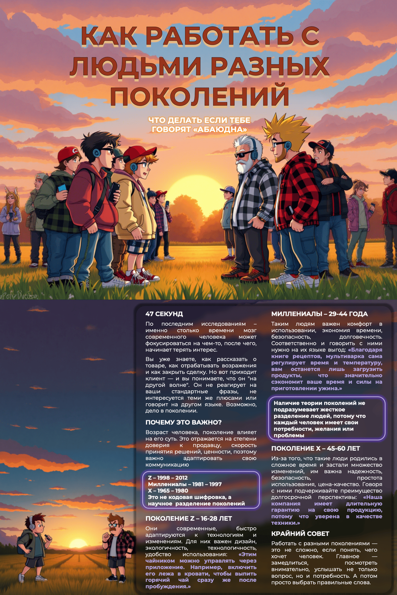 Я уверен, что открывая новости или встречаясь в большой компании, то и дело всплывают слова "бумеры", "зумеры", "миллениалы", "альфа" - что происходит, кто все эти люди, и зачем эти классификации. Теория поколений - это концепция, которая разделяет людей на группы, в зависимости от года их рождения. Эти группы или поколения имеют общие черты, ценности и поведение, которые формируются под влиянием исторических событий, технологических достижений и социальных изменений, происходивших в их молодости. Поколение Х (родившиеся 1965 год - 1980 год) Поколение Y или миллениалы (1980 г. - 2000 г.) Поколение Z (2000 г. - 2012 г.) И поколение Альфа родившиеся после 2012 года У всех этих поколений разные ценности, разные взгляды и стремления. Соответственно с людьми разных возрастов нужно работать по разному. И продавать тоже. Наш мир очень быстро развивается, и важно, перестраивать свое поведение, бизнес, коммуникацию вместе с ним. Только так мы сможем достичь высот. Хороших продаж! Обнял до хруст