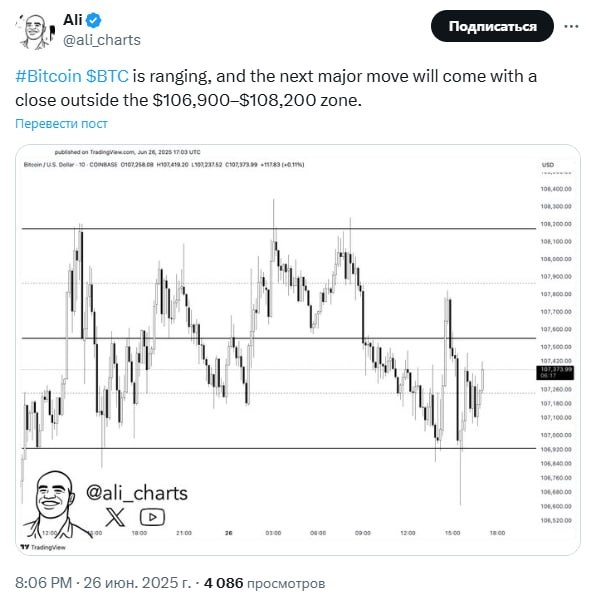 Биткоин торгуется во флэте (боковике), и следующий крупный импульс возникнет при закрытии свечи ЗА пределами диапазона $106 900 – $108 200