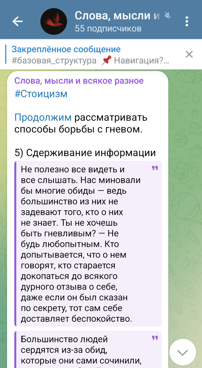 Здравствуйте, наши уважаемые читатели. Наша подборка по стоицизму обогатилась еще одним ценным текстом ученика финансового курса. И мы хотим показать вам этот текст. ******* "Продолжим рассматривать способы борьбы с гневом. 5) Сдерживание информации. Не полезно все видеть и все слышать. Нас миновали бы многие обиды — ведь большинство из них не задевают того, кто о них не знает. Ты не хочешь быть гневливым? Не будь любопытным. Кто допытывается, что о нем говорят, кто старается докопаться до всякого дурного отзыва о себе, даже если он был сказан по секрету, тот сам себе доставляет беспокойство. Большинство людей сердятся из-за обид, которые они сами сочинили, придавая глубокий смысл пустякам или давая волю ложным подозрениям. Гнев приходит к нам часто, но чаще мы приходим к нему. Достаточно любопытный метод. Иными словами, тут как у Аристотеля: на что мы тратим свое время, в том и будет наша профессия. Если же мы потратим время не на какое-либо мастерство, то мы потратим его впуст
