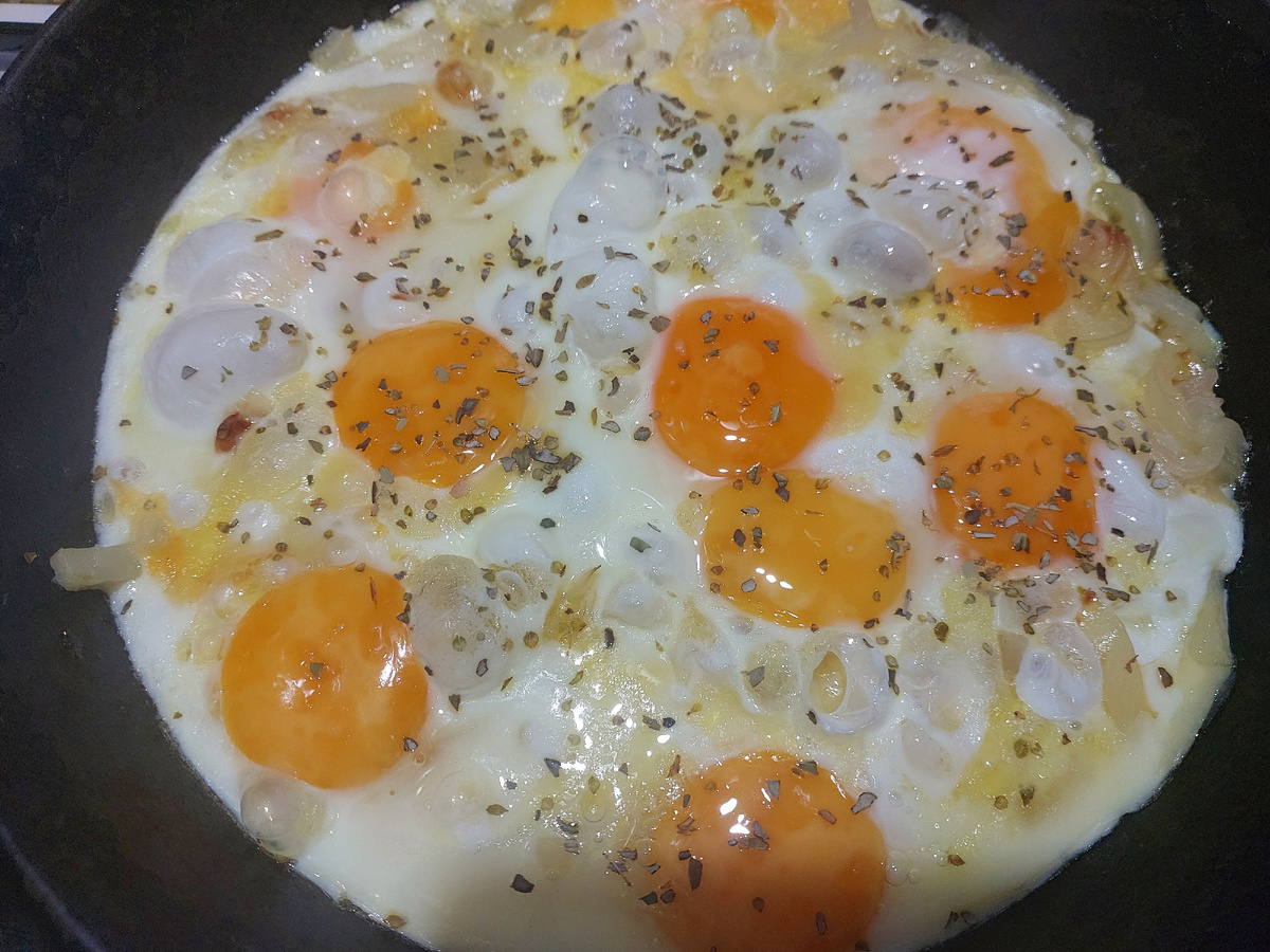 Бывает, открываешь холодильник — а там почти пусто. А готовить что-то надо срочно: все голодные, время поджимает. Так у меня и получилась яичница с овощами из того, что нашлось под рукой. Готовила на 4 человек: 🥚 Яйца — 8 штук 🌶 Перец — 2 штуки 🥔 Картофель — 1 штука 🧅 Лук — 1 штука 🧈 Масло сливочное 🌿 Масло оливковое (можно заменить подсолнечным) 🧂 Соль 🥬 Зелень (для подачи). У меня сушёный орегано. Как готовлю: 1️⃣ На сковороду наливаю немного оливкового масла и добавляю кусочек сливочного — мне нравится аромат и вкус от такой комбинации. 2️⃣ Мелко режу картошку, лук и перец. Отправляю всё это на сковороду, солю и тушу под крышкой минут 5–7, пока овощи не станут мягкими. 3️⃣ Затем аккуратно вбиваю яйца прямо сверху, солю. Накрывать не надо — оставляю жариться до готовности на самом маленьком огне. 4️⃣ В конце — немного орегано (или любую свежую зелень, какая есть под рукой) — и можно подавать. 🍅 Очень хорошо сюда подходят ещё помидоры — можно добавить кусочками в начале
