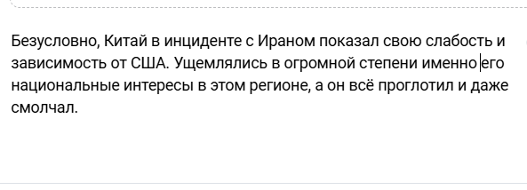 Безусловно, Китай в инциденте с Ираном показал свою слабость и зависимость от США. Ущемлялись в огромной степени именно его национальные интересы в этом регионе, а он всё проглотил и даже смолчал.