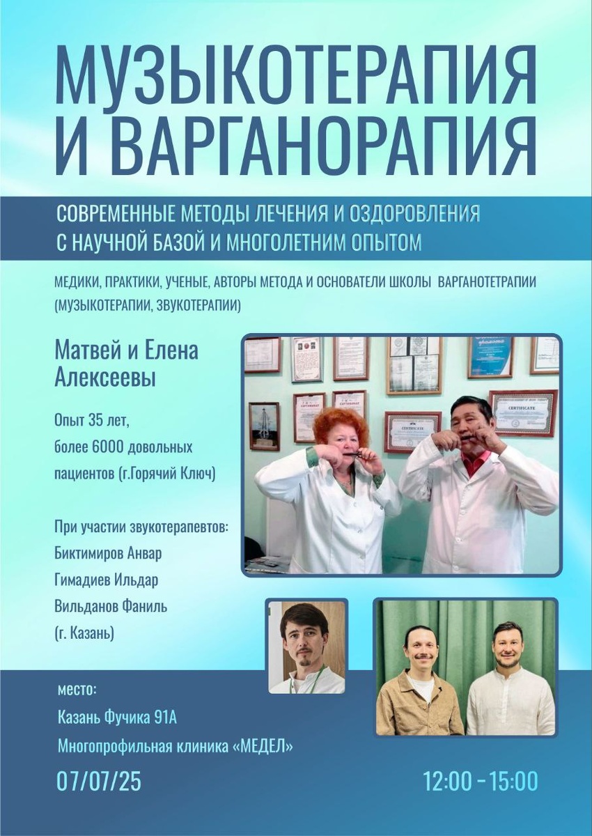 🎵 Научно-практическая конференция в Казани: Музыкотерапия и Варганотерапия – современные методы оздоровления с научной базой и многолетним опытом! 🌿🎶 (Онлайн и оффлайн, записывайтесь на прямое включение!) 🔬 Ведущие эксперты: ⚕️ • Матвей и Елена Алексеевы (г. Горячий Ключ, Краснодарский край) Врачи-практики, авторы метода Медитативно-образная варганотерапия. Медики, ученые, музыкотерапевты, основатели школы музыко- и варганотерапии (звукотерапии). 🎵 • Анвар Биктимиров, Ильдар Гимадиев, Вильданов Фаниль (г. Казань) Музыкотерапевты (звукотерапевты), варганотерапевты, создатели звукотерапевтических инструментов (команда "Твой Космос" 🌌). 📅 Дата: 07 июля ⏰ Время: 12:00 - 15:00 📍 Место: Многопрофильная Клиника МЕДЕЛ (Казань, ул. Фучика, 91А) Оффлайн и онлайн! 💻 🌟 Приглашаем вас открыть для себя мир музыкотерапии и варганотерапии! Узнайте, как древние традиции и современная наука объединяются для оздоровления тела и психики. 🧠💖 🎶 Варганотерапия – это метод с 35-летним опыто