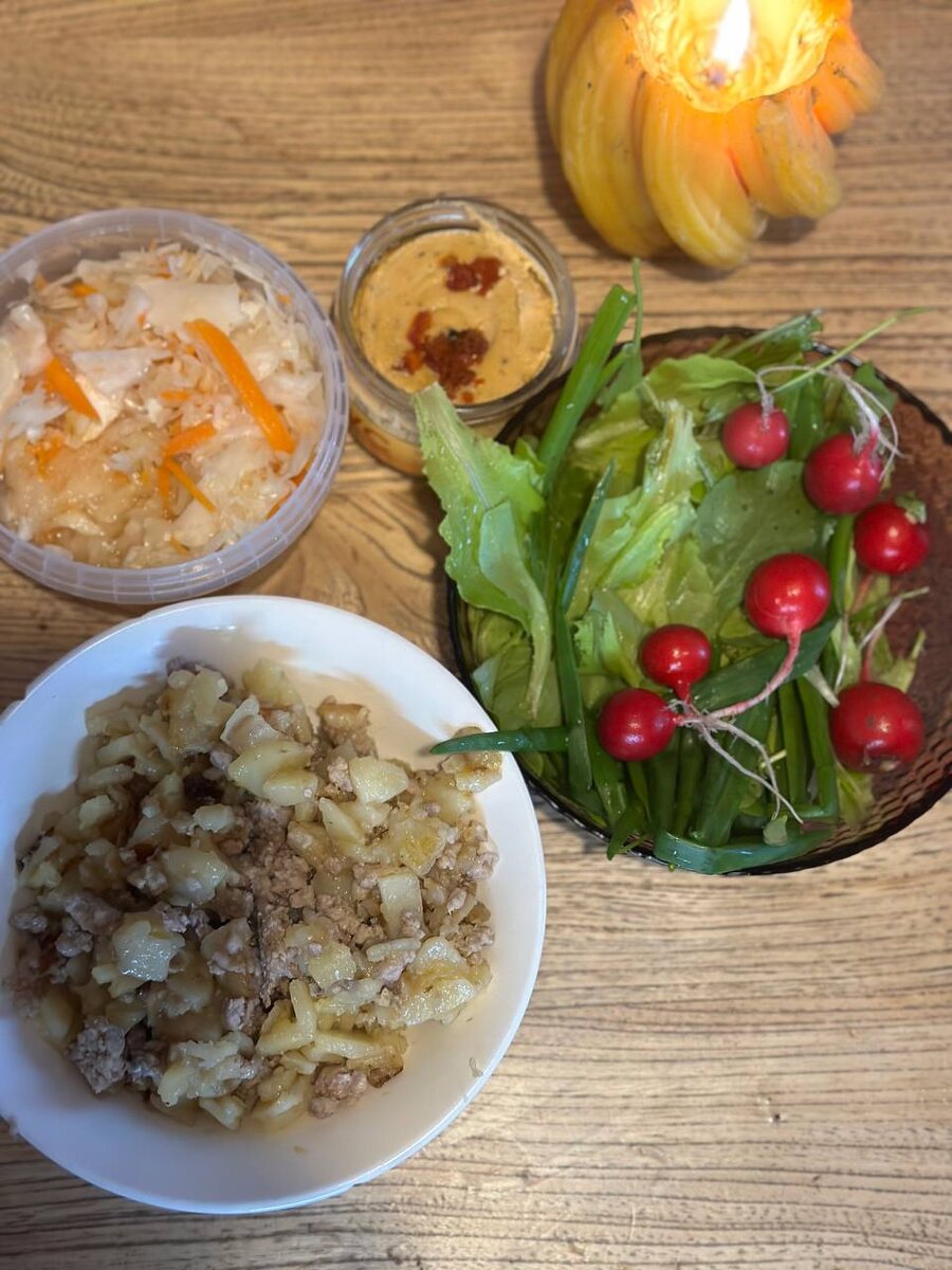 Ешьте много зеленых салатов на ночь, они будут способствовать выработку мелатонина. Картошка жареная на сале+ фарш Капуста квашенная Хумус Зелень