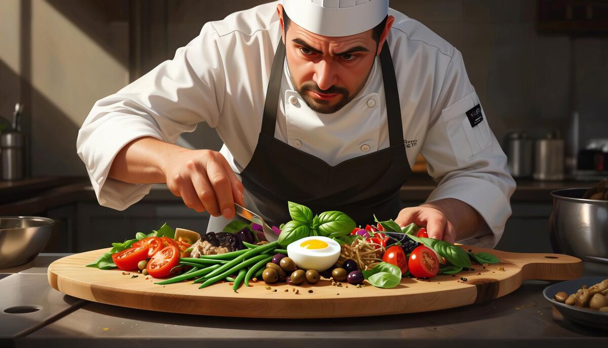 Представьте себе тихий вечер, когда за окном уже погасли огни большого города, а уютная атмосфера дома наполняется лёгким шелестом страниц любимой книги и приятным запахом специй из кухни. Сегодня у нас особый гость – наш любимый шеф-повар Арамис, который приглашает вас насладиться изысканным вкусом знаменитого салата «Нисуаз». Салат «Нисуаз» от Арамиса: это нежнейшее блюдо напоминает нам о прогулках по набережной южного приморского городка, где ветер приносит запахи моря и свежей зелени. Каждое блюдо этого мастера пропитано особой магией вкуса, которая рождается благодаря его уникальной способности чувствовать ингредиенты и сочетать их так тонко, что даже самая простая еда превращается в настоящее произведение искусства. Арамис не просто повар – он волшебник, умеющий превратить обычные продукты в шедевр кулинарии. В своём фирменном рецепте салата «Нисуаз», Арамис раскрывает всю палитру вкусов Средиземноморья. Он подбирает самые свежие овощи и зелень, добавляет немного оливкового масл