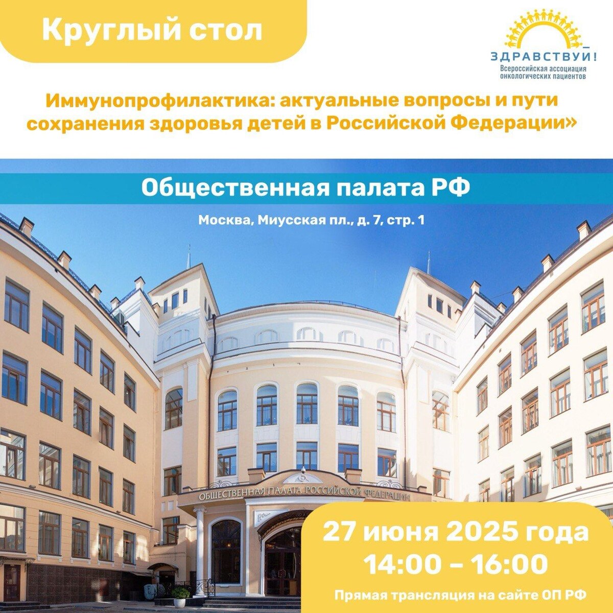Круглый стол «Иммунопрофилактика: актуальные вопросы и пути сохранения здоровья детей в Российской Федерации» 27 июня 2025 года в Общественной палате РФ (Москва, Миусская пл., д. 7, стр. 1, зал ЗОМ-3) состоится круглый стол «Иммунопрофилактика: актуальные вопросы и пути сохранения здоровья детей в Российской Федерации». Время проведения: с 14:00 до 16:00. Организаторы: Всероссийская Ассоциация онкологических пациентов «Здравствуй!» совместно с Комиссией по здравоохранению Общественной палаты РФ. Цель мероприятия — объединить усилия медицинского сообщества, экспертных и пациентских организаций для обсуждения актуальных вопросов иммунопрофилактики, расширения Национального календаря профилактических прививок (НКПП) и повышения доверия к вакцинации. Особое внимание будет уделено защите детского населения от инфекционных заболеваний, решению демографических задач и укреплению системы здравоохранения. Ключевые темы круглого стола: • Включение профилактических прививок от целевых инфекц