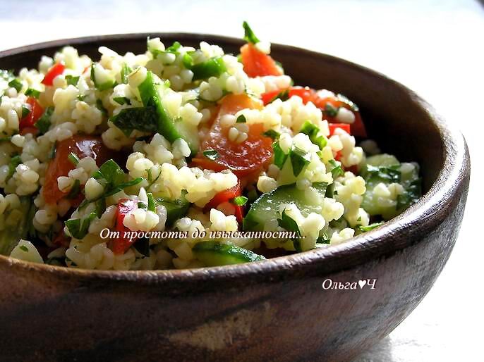 2-3 ст. л. растительного масла Приготовление: Отварите булгур до готовности, воду слейте. Овощи нарежьте, добавьте к булгуру, перемешайте. Добавьте рубленную зелень, лимонный сок, масло, соль и перец, Перемешайте. Подавайте к столу. Приятного аппетита! Вам также могут понравиться: