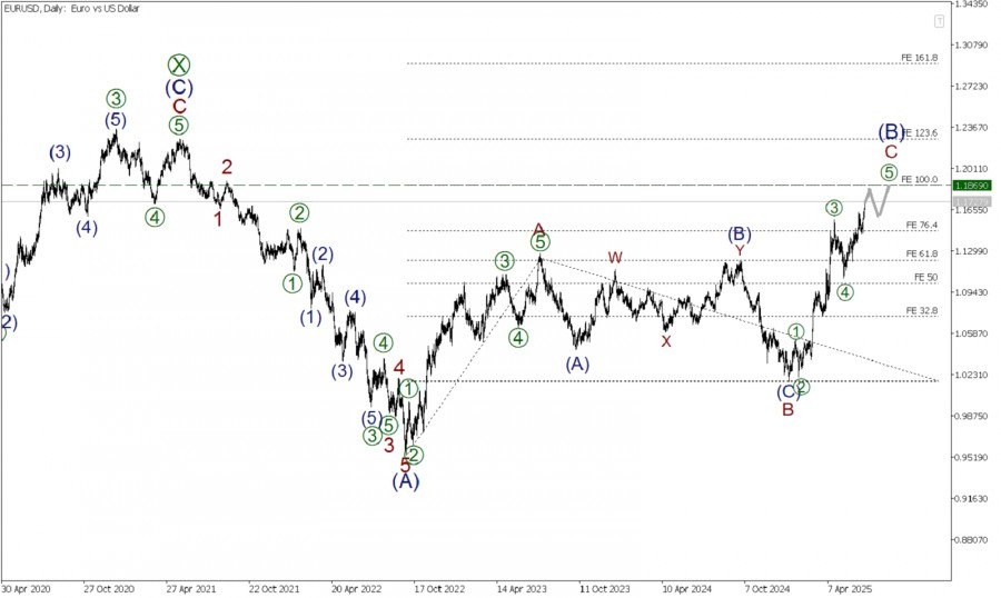 https://basechop.ru/wordpress/?p=48201 Рынок по Евродоллару в долгосрочной перспективе может формировать крупную бычью коррекция (B), которая принимает форму стандартного зигзага A-B-C. На сегодняшний день полностью завершены только первые две его части – импульс A и коррекция B. На последнем участке графика мы можем наблюдать развитие бычьей волны C, которая, по всей видимости, принимает форму импульса. На текущий момент завершены первые четыре его части – подволны [1]-[2]-[3]-[4]. В процессе построения ,бычья финальная подволна [5]. Большая вероятность, что быки внутри волны [5] смогут отправить рынок в область уровня 1.186. На указанной отметке величина крупной импульсной волны C составит 100% по расширению Фибоначчи от предыдущей импульсной волны A. Таким образом, при продолжении роста, стоит рассмотреть открытие длинных позиций с текущего уровня, с целью забрать прибыль на указанной отметке. После достижения уровня 1.186, ожидается смена тренда, а именно ожидается развитие…