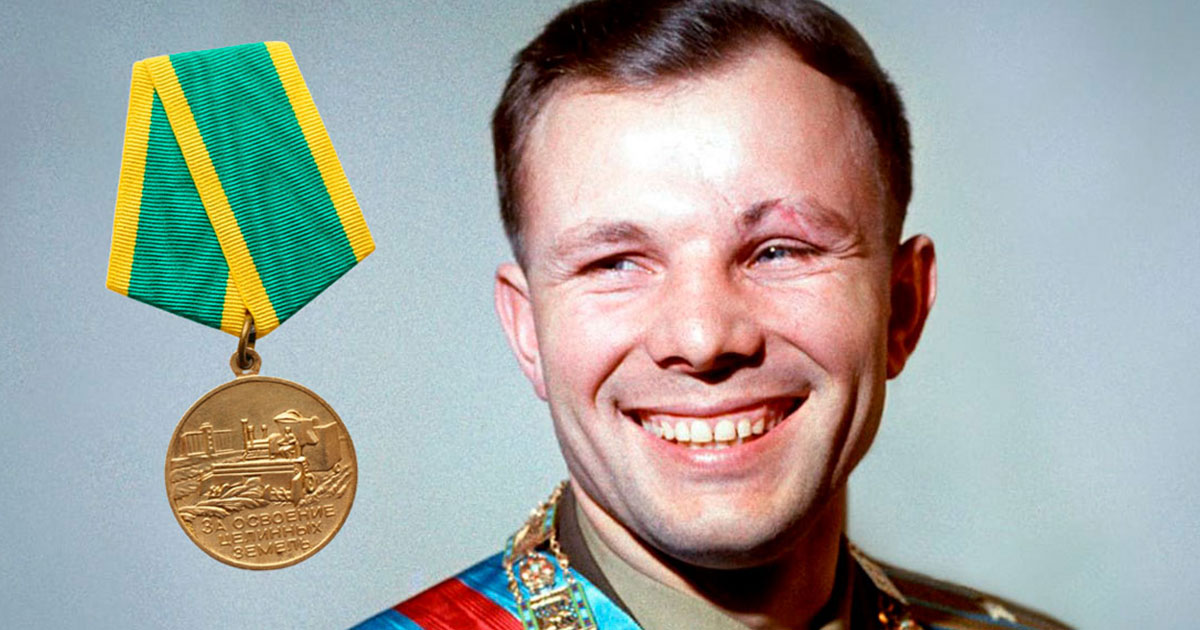 12 апреля 1961 года, спустя 108 минут после старта и совершив первый в истории пилотируемый полёт на корабле «Восток-1», Юрий Алексеевич Гагарин благополучно приземлился в Саратовской области. Первой государственной наградой, вручённой ему непосредственно на месте посадки экипажа вертолёта Ми-4, стала медаль «За освоение целинных земель». Медаль «За освоение целинных земель» учреждена Указом Президиума Верховного Совета СССР 20 октября 1956 года и предназначалась для поощрения колхозников, работников совхозов, МТС и других организаций за эффективную двухлетнюю работу в районах освоения целинных и залежных земель Казахстана, Сибири, Урала, Поволжья и Северного Кавказа2. Несмотря на то что Гагарин совершил подвиг в космосе, традиция вручать «целинную» медаль космонавтам сразу после посадки зародилась случайно: экипаж вертолёта, первым обнаружив обгоревший спускаемый аппарат, прижав к кителю пилота-космонавта ту же награду, что вручается «полевикам» на целине. Медаль изготавливается из цв