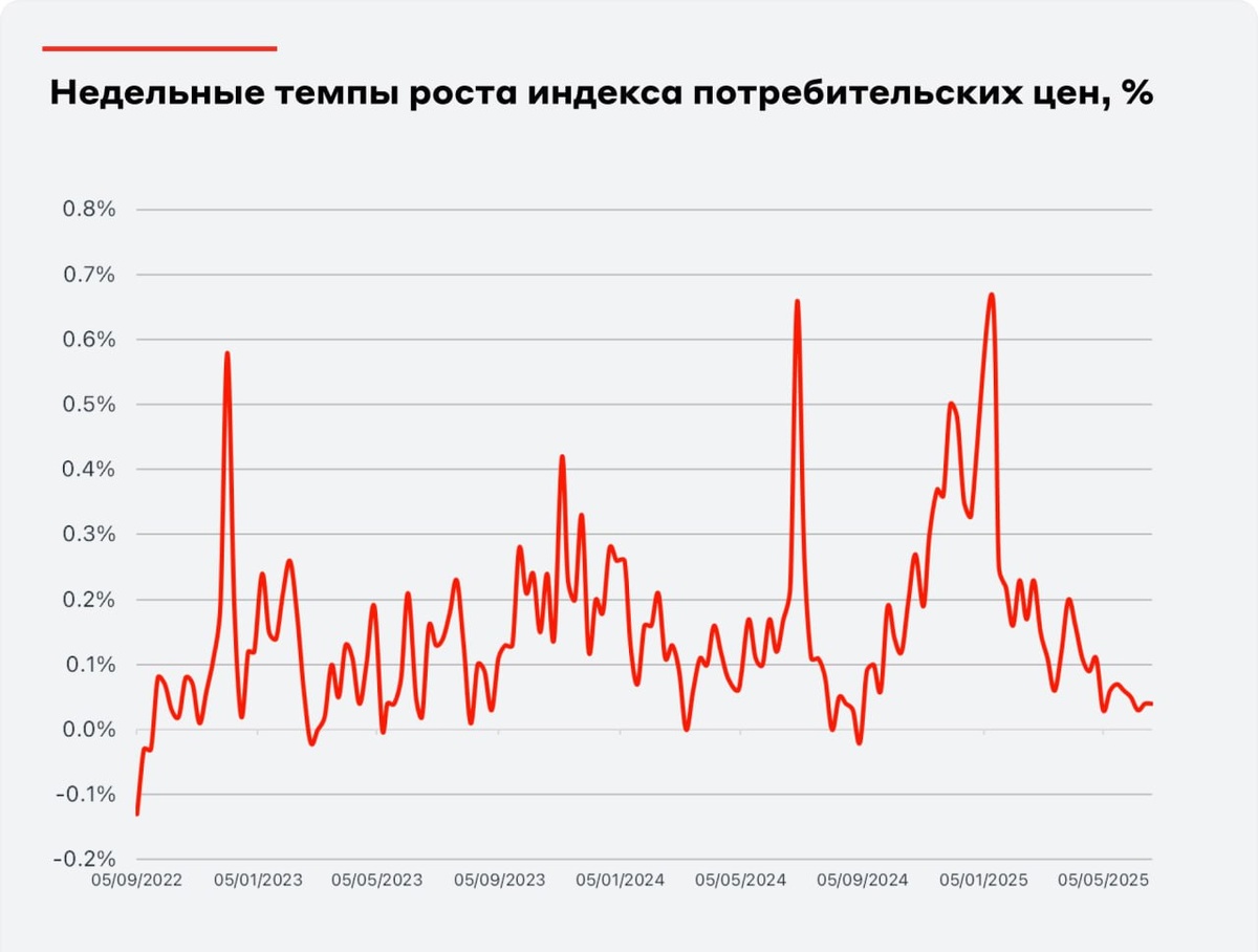 По данным Росстата, за неделю с 17 по 23 июня цены в России выросли на 0,04%, сохранив своё значение с предыдущего отчёта. Годовая инфляция продолжает снижаться и достигла 9,4% (против 9,6% неделей ранее). С начала 2025 года потребительские цены выросли на 3,68%.