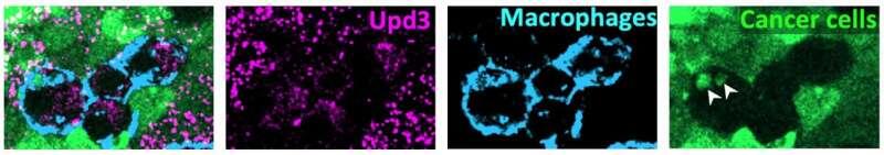 Когда макрофаги плодовых мух потребляют умирающие раковые клетки, они производят воспалительный цитокин под названием Upd3, белок, аналогичный человеческому IL-6. Этот Upd3 активирует белки JAK и STAT внутри живых раковых клеток. Обычно эти белки координируют иммунные ответы и восстановление тканей, но раковые клетки перехватывают этот процесс: они включают гены, которые заставляют их производить собственный Upd3, усиливая активацию JAK и STAT и способствуя росту опухоли.