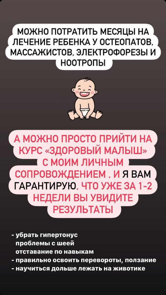 Пока одни мамы тратят время и деньги на походы по врачам и массажистам, другие получают результаты самостоятельно на моем курсе «Здоровый малыш» ❤️ Уже в первую неделю занятий С помощью простых упражнений, занимаясь всего 15 мин в день ✅ 💬 «Ортопед сказал, что кривошеи больше нет и наклона тоже нет» 💬 «Дольше держим голову и меньше напряженности в теле стало» 💬 «Голова уже не имеет такой привычный наклон, всё чаще лежит прямо» - Тогда я жду вас на курсе «Здоровый малыш» Отвечаю на вопросы о здоровье ваших малышей в Телеграм - не стесняйтесь, пишите) Всем рад Ваш доктор Сабуров Читайте также: Кривошея у ребенка? 👉 Бесплатный урок: причины и решения ✅ Артур Сабуров
