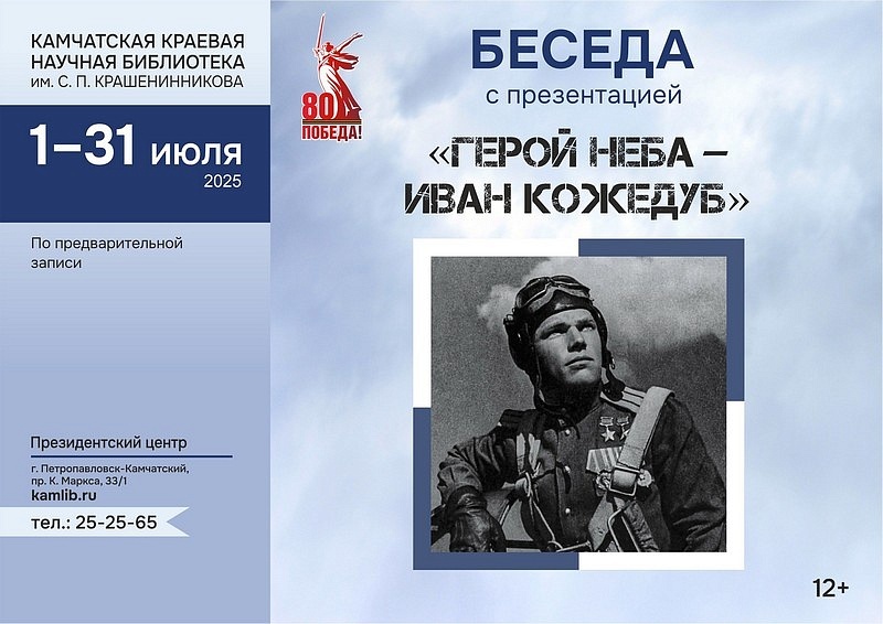 Жителям Камчатки расскажут о герое неба Иване Кожедубе Камчатская краевая научная библиотека им. С.П. Крашенинникова в июле приглашает посетить беседу «Герой неба Иван Кожедуб», передает агентство «КАМЧАТКА-ИНФОРМ». Иван Кожедуб – участник Великой Отечественной войны, советский военачальник, маршал авиации, летчик-истребитель. «Посетителям расскажут о молодых годах Ивана Никитовича, учёбе на летчика, его боевых вылетах и победах в годы Великой Отечественной войны