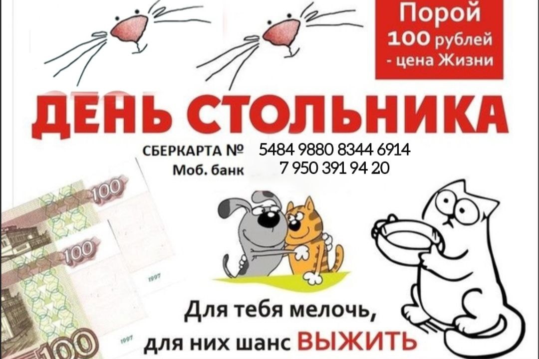 Дорогие друзья! Огромное всем спасибо, кто вчера экстренно откликнулся на наш крик души. Всем низкий поклон и огромная благодарность. С Вашей помощью удалось отложить на аренду 20000 рублей! 🙏🏻 Это очень радует- хоть одну из трех сможем заплатить!!!💪 Ну а сбор на две аренды- это "тема дня" сегодня! ВЕДЬ СЕГОДНЯ ТРАДИЦИОННЫЙ ДЕНЬ СТОЛЬНИКА - ДЕНЬ ДОБРЫХ ДЕЛ!!! ❤️❤️❤️ ПОЖАЛУЙСТА, ПРИСОЕДИНЯЙТЕСЬ КО ДНЮ СТОЛЬНИКА❗️ 🔷НА НУЖДЫ, 🔷 НА АРЕНДУ, МЫ ОЧЕНЬ НУЖДАЕМСЯ В ВАШЕЙ ПОМОЩИ. 🙏🙏🙏 Теперь наш отчет за 26.06.25: Наличными 1000р. От Татьяны Л. Таня, спасибо тебе огромное за косточки, за обрези, и за помощь. 🙏🙏🙏 Баланс: 15690р. Пополнение карты Альфа банка 1000р. От Ариадна В. Сообщение: на корм. Баланс: 16690р. Пополнение карты Альфа банка 2000р. От Татьяна Ч. Сообщение: дарение Баланс: 18690р. Пополнение карты Тинькофф 2000р. От Николай Л. Сообщение: Собачкам на корм. Баланс: 20690р. ECMC6914 06:57 Перевод 1000р от Галина С. Баланс: 21690р «Благотворительно на нужды приют