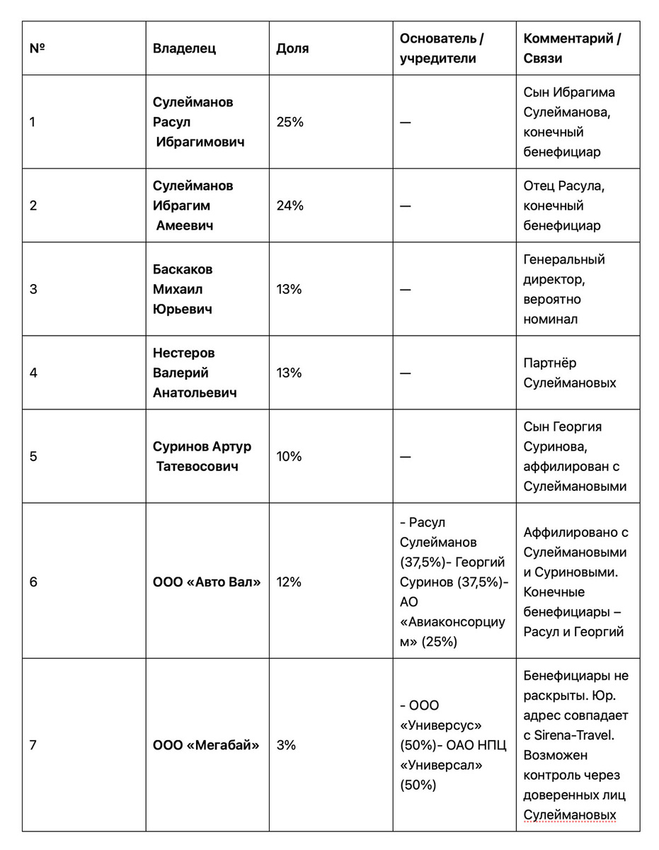 Бенефициары не раскрыты. Юр. адрес совпадает с Sirena-Travel. Возможен контроль через доверенных лиц Сулеймановых