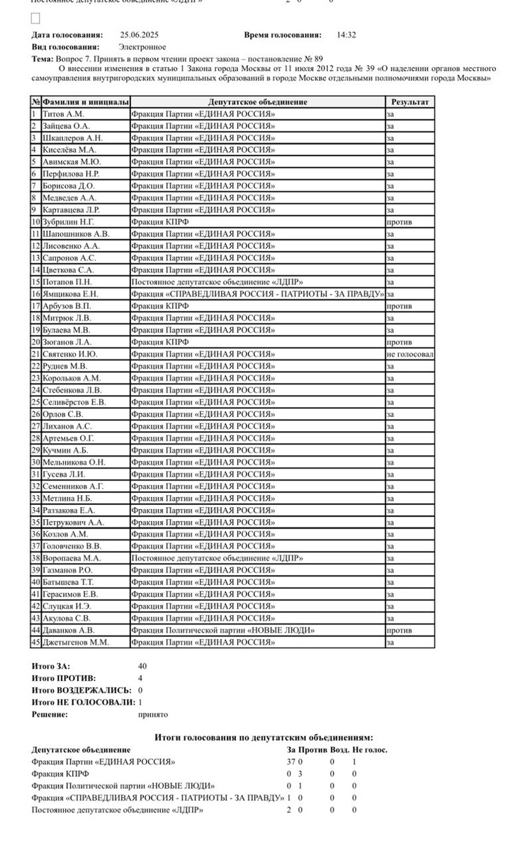 Позавчера МГД приняла закон «О внесении изменения в статью 1З закона города Москвы от 11 июля 2012 года № 39 ...», внесенный 18 июня комиссией по транспорту и развитию дорожно-транспортной инфраструктуры, председатель Цветкова Сабина Алановна (ЕР, избирательный округ № 14, Богородское, Метрогородок, Сокольники, часть Гольяново). Де-юре «созданы дополнительные возможности для жителей многоквартирных домов по установке ограждающих устройств на придомовых территориях и развитию транспортной системы города Москвы». Де-факто устанавливать шлагбаумы будет неизвестный монополист, связанный с ГКУ «Администратор Московского парковочного пространства» (АМПП), без согласования с муниципальными депутатами. Инициировать процесс сможет единственный житель, согласование пройдет в «электронном доме» с прогнозируемым результатом, после рекламного бесплатного года оплачивать шлагбаум будут ВСЕ жильцы огороженной территории. Результаты голосования: - против КПРФ и НЛ; - поддержали ЕР, ЛДПР и СР.