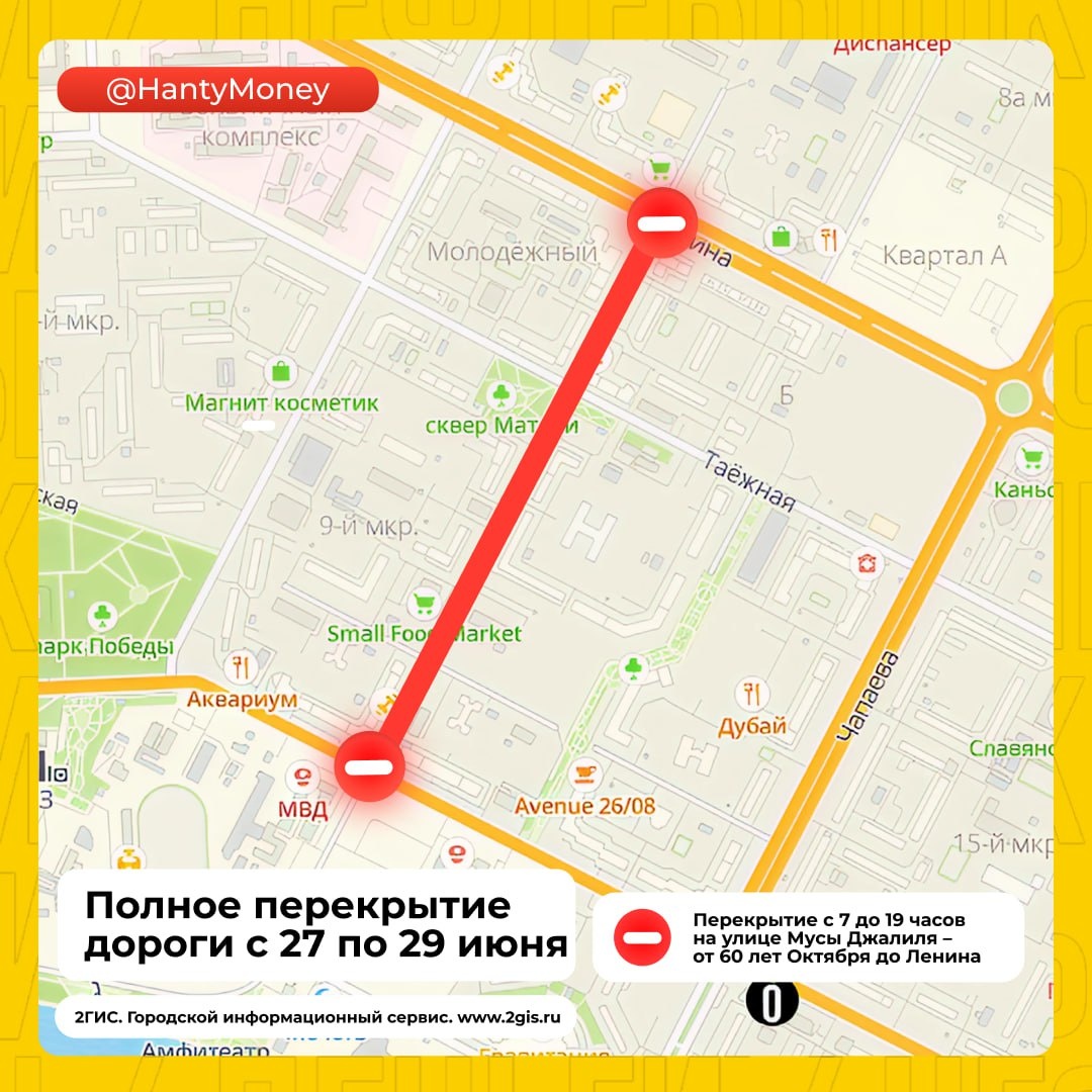 🛠С 27 по 29 июня участок улицы Мусы Джалиля от 60 лет Октября до Ленина с 7:00 до 19:00 будет закрыт. Дорожники приступают к ремонту асфальта!