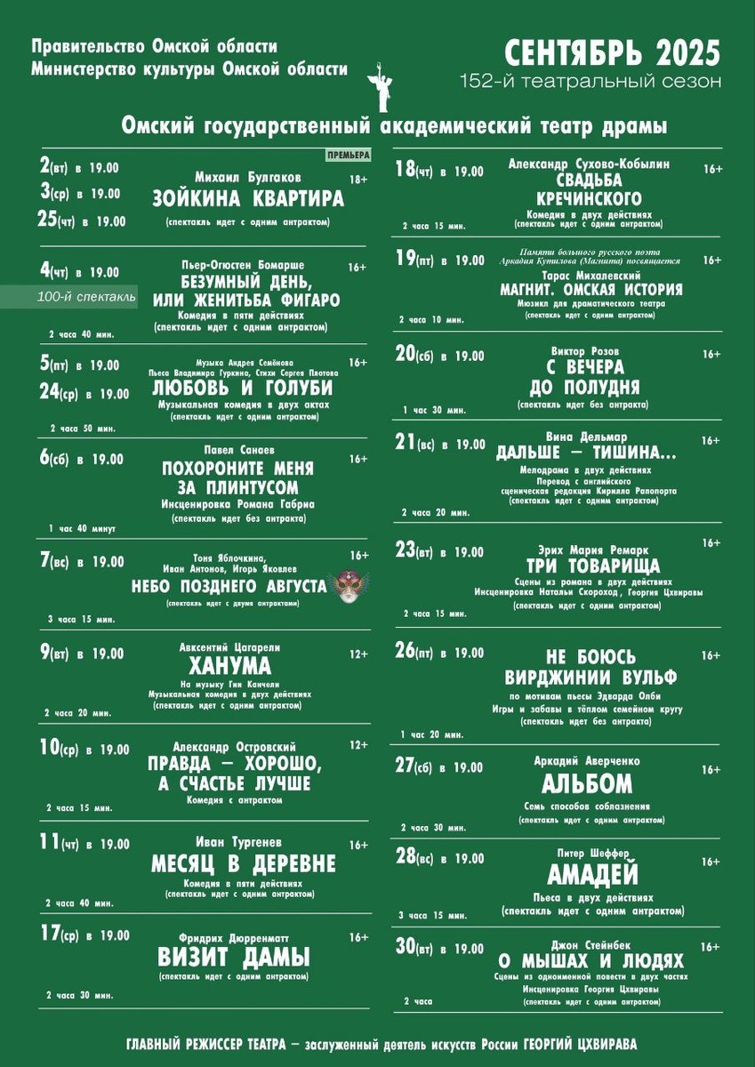 Уважаемые зрители! Сегодня, 27 июня, в 15:00 в театральных кассах и на сайте omskdrama.ru открывается продажа билетов на репертуар сентября! 2 сентября Омский академический театр драмы открывает 152-й театральный сезон премьерным спектаклем "Зойкина квартира" по пьесе М. Булгакова в постановке главного режиссера театра Георгия Цхвиравы. До встречи в новом сезоне! #омскдрама_новость #омскдрама152