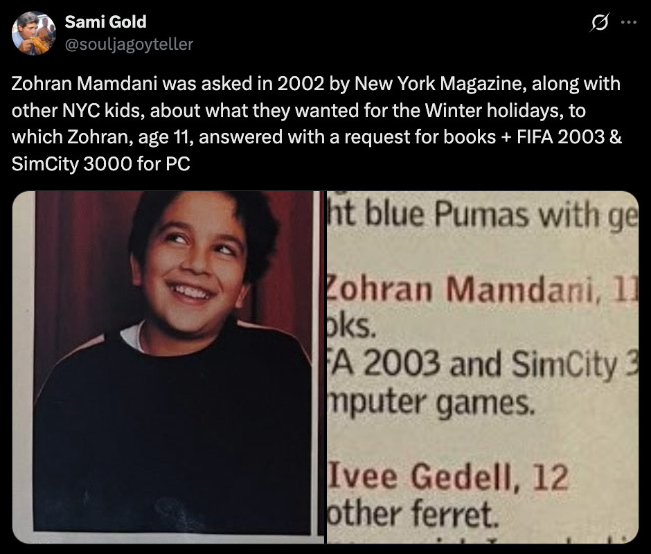 Твит содержит изображения из статьи New York Magazine 2002 года, в котором детей Нью-Йорка спрашивали, какие подарки они хотели бы получить на праздники. Среди опрошенных был 11-летний Зохран Мамдани, который поделился своим списком желаний: книги, FIFA 2003 и SimCity 3000.