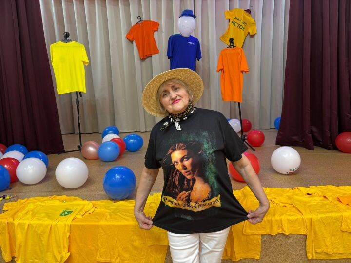 На праздник Нина Михайловна пришла в футболке с изображением Киры Найтли — актрисы из известного фильма «Пираты Карибского моря» (12+).