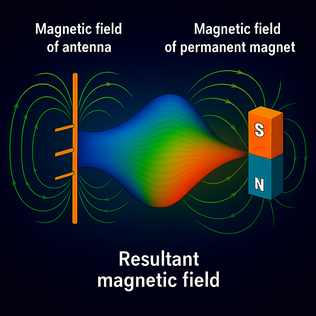 Взаимодействие постоянного магнита с магнитным полем антенны описывается суперпозицией полей. Статическое поле магнита H_pm накладывается на переменное поле антенны H_ant(t), создавая результирующее поле: