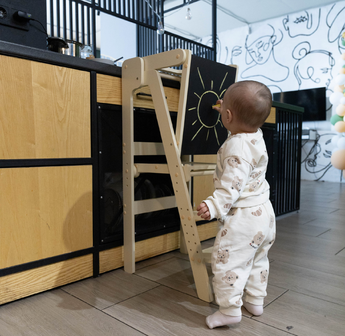 Представьте: на кухне вы готовите обед, а рядом — довольный малыш, с интересом мешает ложкой в миске, подглядывает в кастрюлю, моет яблоко или рисует на доске. И всё это — без капли паники с вашей стороны. Это не фантазия, а реальность, если в доме есть Башня помощника Монтессори. Это устойчивая и безопасная платформа, которая помогает малышу «подрасти» до взрослого мира — до раковины, стола, кухонной столешницы. Она выполнена в виде лесенки с ограждением, чтобы ребёнок мог стоять на ней самостоятельно, не рискуя упасть. Башня разработана так, чтобы ребёнок мог забираться и спускаться сам, а вы при этом не дергались от страха, что он упадёт. Методика Монтессори базируется на уважении к ребёнку и предоставлении ему возможности делать всё самому. Башня — прекрасный инструмент, чтобы включить ребёнка в повседневные дела: готовить, мыть овощи, расставлять тарелки. Залезть, удержать равновесие, поучаствовать в настоящих делах — всё это отлично развивает и тело, и мышление. Есть модели с вст