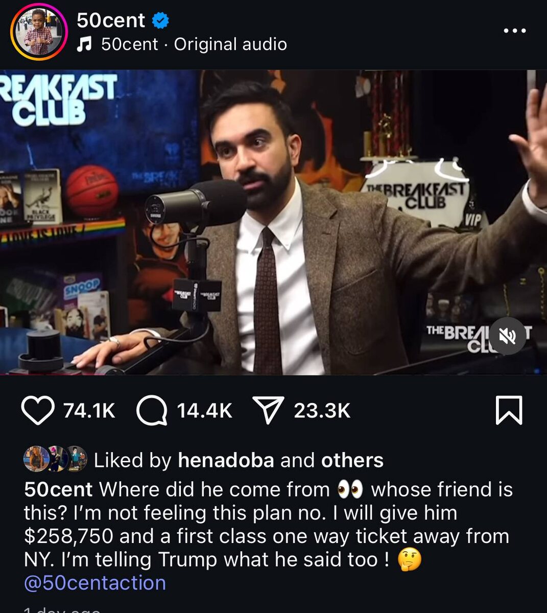 Rapper 50 Cent offered Zohran Mamdani CASH to GET LOST after he name-dropped him I’m not feeling this plan. No. I will give him $258,750 and a first class one-way ticket away from NY — 50 Cent