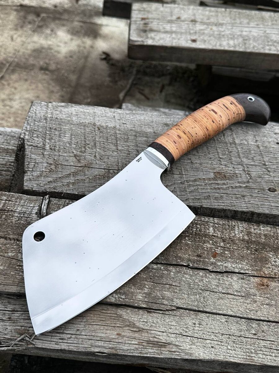 В свободной продаже тяпка из отечественной нержавеющей стали 95х18. Сталь прочная на излом, долго держит заточку и не требует к себе никакого ухода. Тяпка отличный помощник на кухне и в лесу. Рукоять теплая из бересты. Твердость клинка (HRC): 58 Цена за тяпку: 8.910 рублей. В комплекте идут ножны из натуральной кожи. Можем сделать формованные ножны +8000 рублей. Для заказа писать на @Nazarklinokbot или по тел +79101343831 WhatsApp/Viber