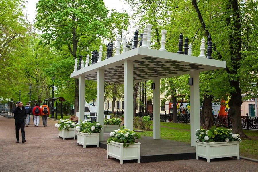 Прогулку получится продолжить на Гоголевском бульваре, который превратился в шахматное царство с тематическими арт-объектами, топиарами в виде ферзей и коней и с беседками для шахматных партий.
