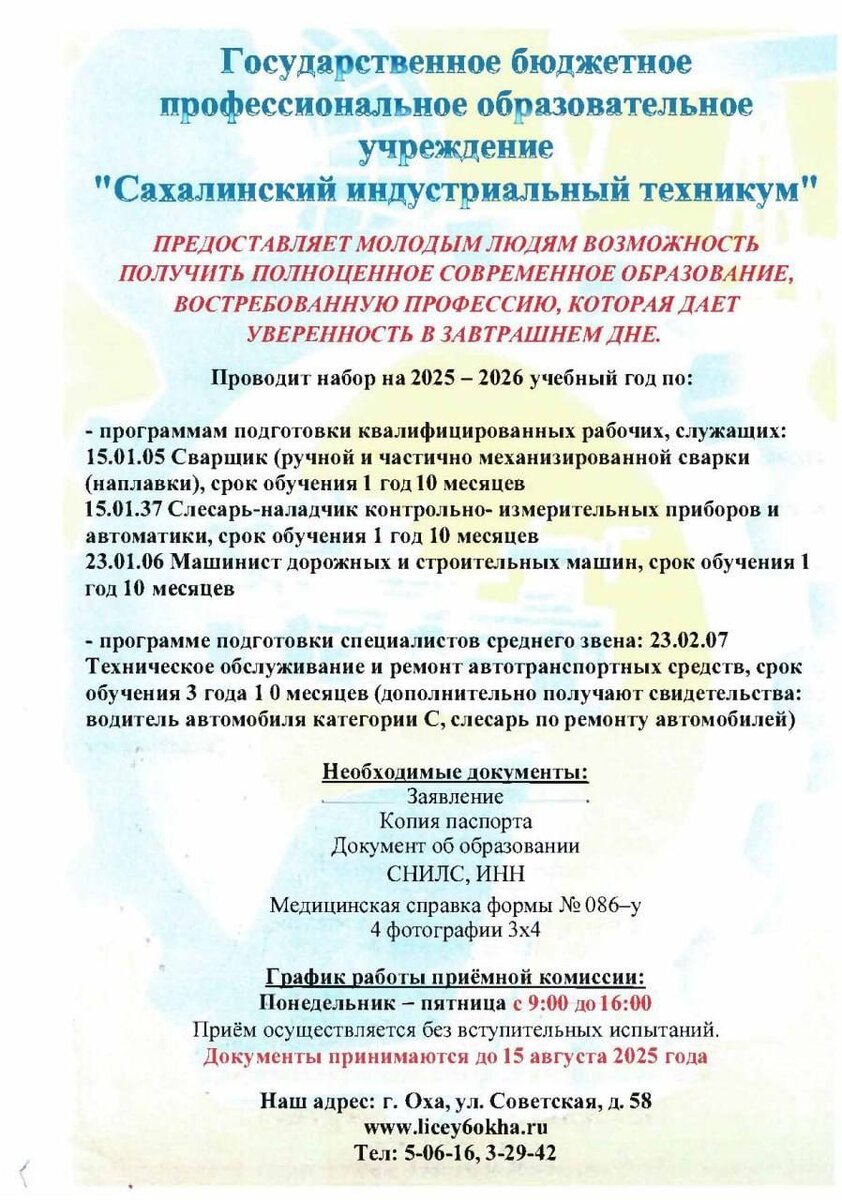 "Сахалинский индустриальный техникум" предоставляет молодым людям возможность получить полноценное современное образование, востребованную профессию, которая дает уверенность в завтрашнем дне. Проводит набор на 2025 - 2026 учебный год. 🔵 Подпишись на ТВ «ОХА» | Прислать новость ✉️ Получи денежное вознаграждение 🪙