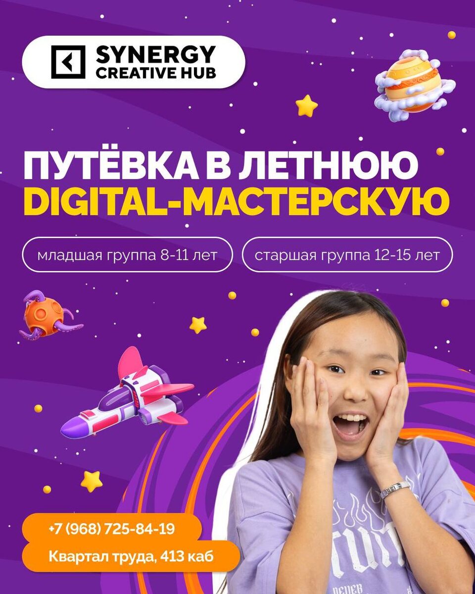 Мастерская креативных профессий «Synergy Creative Hub» #МК #Детям #ЛетнийЛагерь Что ждет детей 8–11 лет: - создание мультфильмов и анимации; - придумывание захватывающих историй; - прокачивание коммуникационных навыков. А подростков 12–15 лет: - создание 3D-вселенных в Unity; - покорение нейросетей и пробы в дизайне; - прокачивание креативности, работы в команде и коммуникации. Формат мастерской: - 2 недели по 4 часа, - с понедельника по пятницу Старт смены 30 июня Следующие смены: 14 июля, 28 июля, 11 августа Труда, 1, 413 каб. От 12 000 руб.(действуют акции и скидки) Спрашивать по номеру: +79687258419 Подробнее Online Якутия | Подписаться