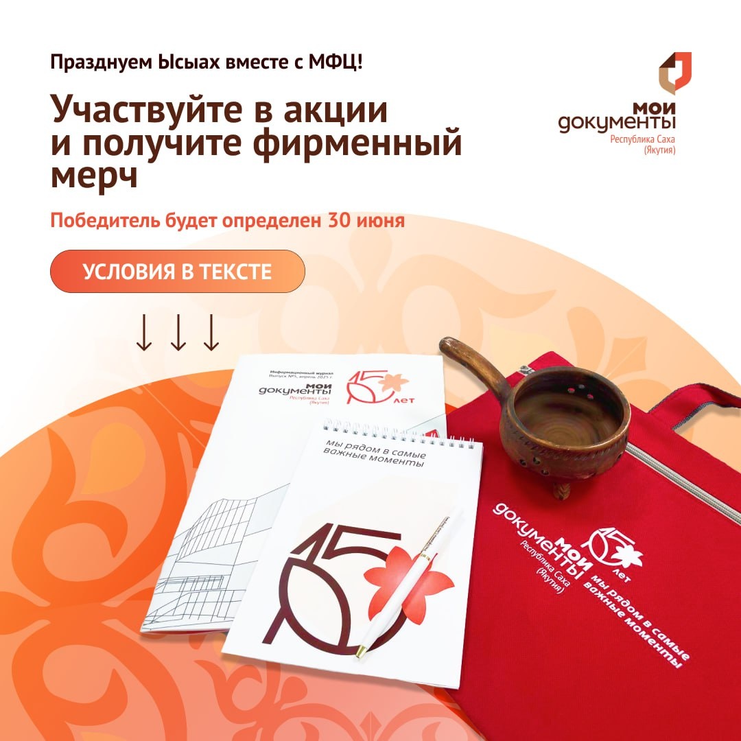 Праздничная акция от МФЦ в честь "Ысыах Туймаады – 2025"!❤️ 🚀Дорогие друзья! В честь самого яркого и долгожданного праздника лета – Ысыаха Туймаады – МФЦ запускает особенный розыгрыш! 🎁Призы: ➡️Фирменный мерч центра "Мои Документы"; ➡️Якутская обрядовая утварь - хомпуор. ℹ️Как принять участие? 1️⃣Подпишитесь на наши официальные каналы: ➡️Телеграм ➡️ВКонтакте 2️⃣Напишите в комментариях под этим постом поздравление с Ысыахом – поделитесь праздничным настроением! 🕓Итоги розыгрыша - 30 июня 2025 года. ➡️Победитель будет определен с помощью генератора случайных чисел. Маннык үтуө күҥҥэ, маннык кэрэ кэмҥэ, Саха киһитэ ыһыах ыһар үгэстээх!❤️