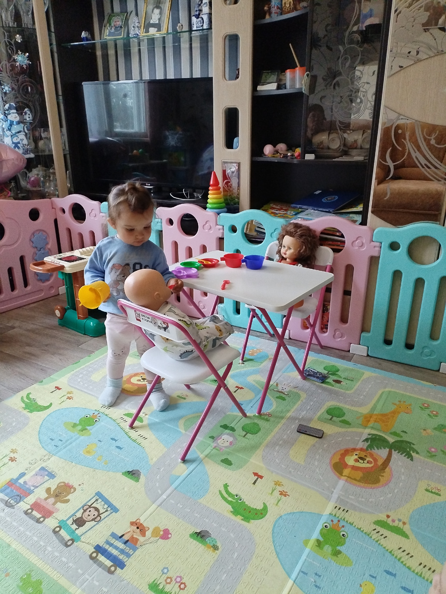 Сестра слепила из пластилина кошку. Севе хотела дать. Он не оценил. Машину бы. А тут кошки какие-то, на кошек и непохожие. Зато Амелия взяла кошечку и с удовольствием играла. И прыгала по столу у нее кошка, и из миски пила, и под стол пряталась. Хорошо поиграли.