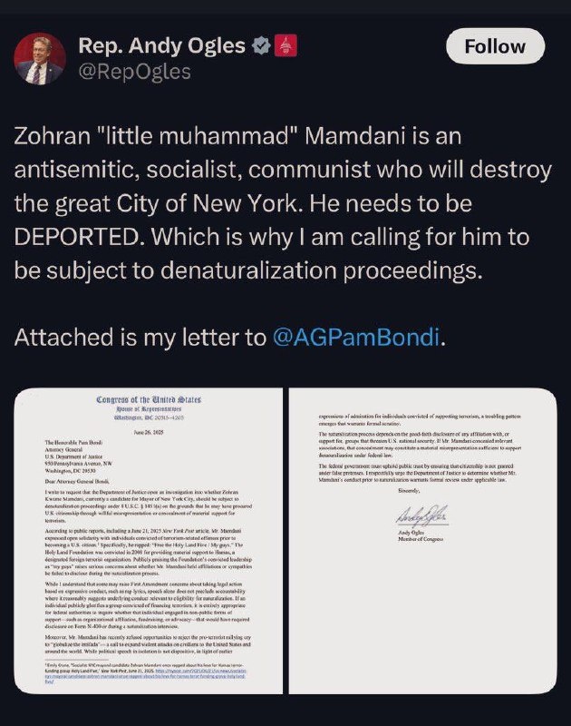 Rep Ogles calls Mamdani ‘little muhammad’ and demands AG Bondi REVOKE his citizenship and deport him Claiming he may have provided ‘material support to Hamas’ ‘If you lied on your N-400 naturalization forms, you’re going home’ ‘Mr. Mamdani has recently refused opportunities to REJECT the pro-terrorist rallying cry’