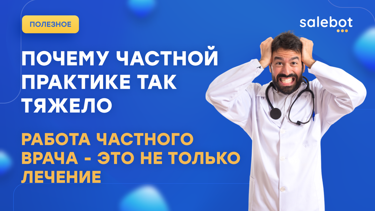 Им тоже непросто. Попробуй дозвониться, уточни, когда есть место, потом найди реквизиты для оплаты, потом вспомни, где ты это всё записал. Кажется, что медицина — это про здоровье. Но часто это про администрирование. И если вы частный врач, вы наверняка мечтали: Хорошая новость — это возможно. 🔧 Salebot — помощник, который всё это умеет: Вместо того чтобы быть врачом-администратором, вы снова станете просто врачом.