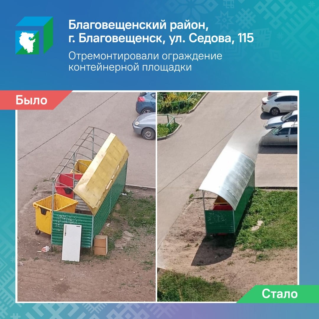 😀😃😄😁 25 июня 2025 года в Благовещенске по ул. Седова, 115 после обращения местных жителей отремонтировали ограждение контейнерной площадки. О том, что после сильного ветра отошло покрытие, они написали в соцсети –– информационные системы ЦУР Башкортостана зафиксировали сообщение. Обращение отработали коллеги из администрации Благовещенского района и специалисты УК «КомСтройСервис». А житель в комментариях поблагодарил всех за работу. Укрепили конструкцию остановочного павильона и в Нефтекамске на остановке по улице Янаульской. О том, что отошла опора строения, в соцсетях 22 июня написала бдительная жительница. Комментарий выловил робот ЦУР Башкортостана. Коллеги из администрации города передали сообщение в подрядную организацию. 25 июня проблему устранили. 💚 ЦУР Башкортостана