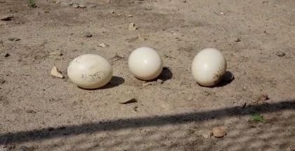 В Ярославском зоопарке показывают гигантские яйца Их снесла страусиха Дуся. Огромные яйца размером больше голубя весят от полутора до двух килограммов. Будущие птенцы преспокойно лежат на травке в вольере страусов на основной территории зоопарка. А огромная мамаша их охраняет, отгоняя любопытных соседей от потомства. Страусиные яйца в 25 раз крупнее куриных, но относительно размеров птицы, которая их снесла, довольно маленькие. В зоопарке предупредили, что птенцов может и не быть, как бы ни старалась Дуся сберечь яйца.